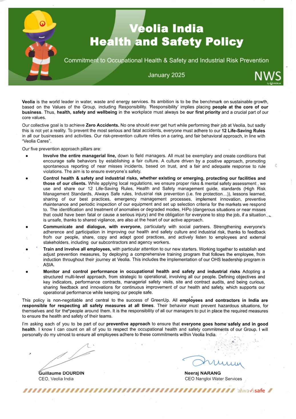 At Nangloi Water Services Pvt Ltd , the health and safety of our employees, customers, community, and environment are our top priorities. We are dedicated to maintaining a safe working environment and ensuring the well-being of everyone associated with our operations. As part of this commitment, we adhere to stringent guidelines and protocols established by regulatory authorities. Our team participates in regular training sessions and organizes an annual Health & Safety Week to stay updated on the latest practices and procedures. We encourage everyone to stay informed and take necessary precautions to protect themselves and others.